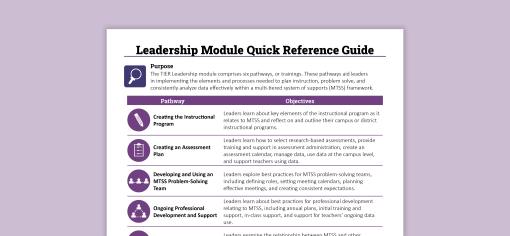 The TIER Leadership module comprises six pathways or trainings. These pathways aid leaders in implementing the elements and processes needed to plan instruction, problem solve, and consistently analyze data effectively within a multi-tiered system of supports (MTSS) framework.