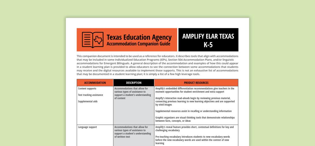 In this Accommodation Companion Guide, a general description of the accommodation and examples of how this could appear in a student learning plan is provided to allow educators to see the connection between some accommodations that students may receive and the digital resources available to implement those supports. This is not an exhaustive list of accommodations that may be documented in a student learning plan; it is simply a list of a few high leverage tools.