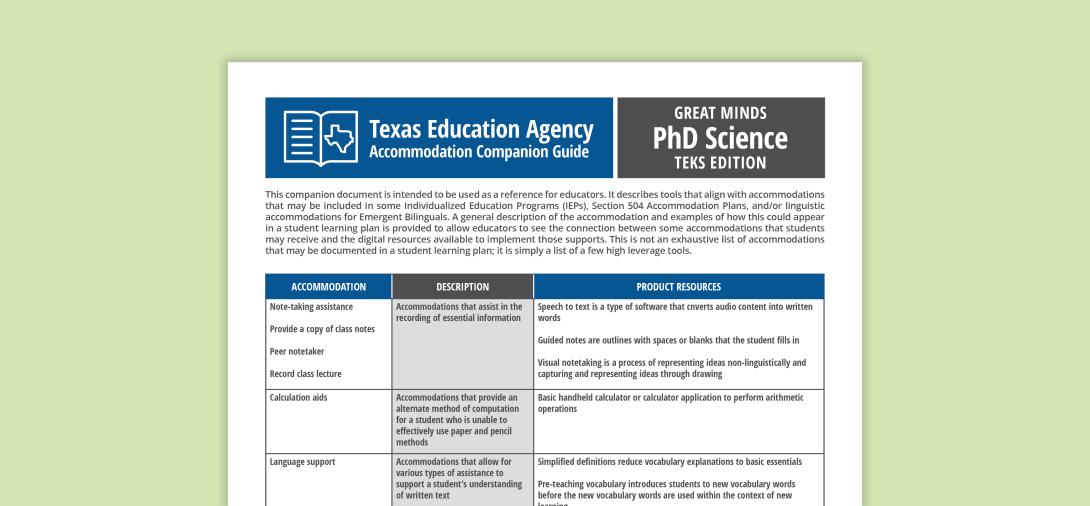 In this Accommodation Companion Guide, a general description of the accommodation and examples of how this could appear in a student learning plan is provided to allow educators to see the connection between some accommodations that students may receive and the digital resources available to implement those supports. This is not an exhaustive list of accommodations that may be documented in a student learning plan; it is simply a list of a few high leverage tools.