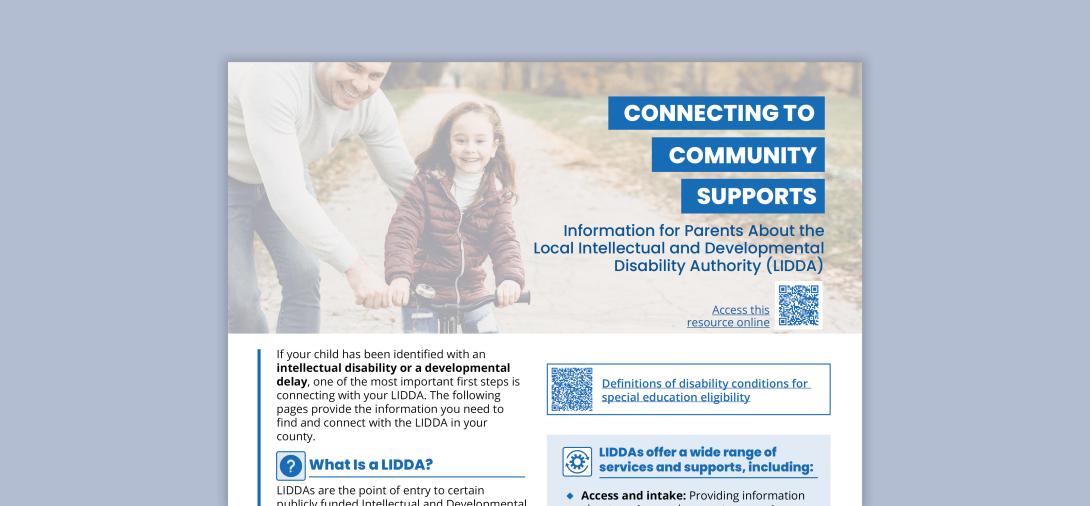 To share the required information at the first admission, review, and dismissal (ARD) committee meeting during which the individualized education program (IEP) is developed for a student with an intellectual disability or a developmental delay, each local educational agency (LEA) will use the Connecting to Community Supports resource to ensure that families are provided with information about their LIDDA. Before distributing this resource, add local contact information in the appropriate fields.