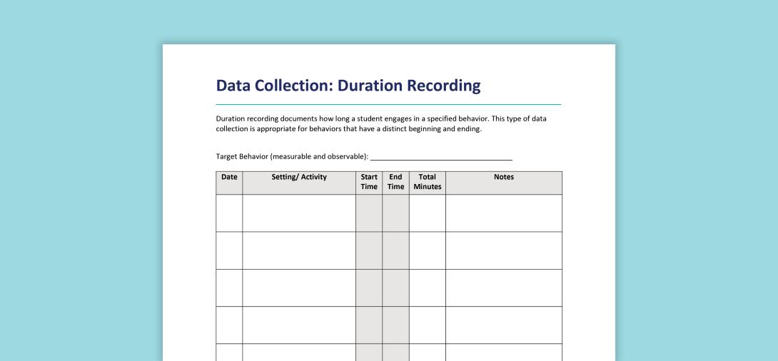 Duration recording documents how long a student engages in a specified behavior. This type of data collection is appropriate for behaviors that have a distinct beginning and ending.
