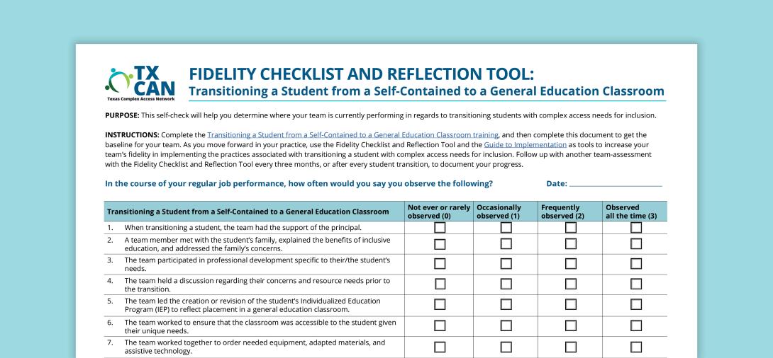 Complete the Transitioning a Student from a Self-Contained to a General Education Classroom training and then complete this document to get the baseline for your team. As you move forward in your practice, use the Fidelity Checklist and Reflection Tool and the Guide to Implementation as tools to increase your team’s fidelity in implementing the practices associated with transitioning a student with complex access needs for inclusion. Follow up with another team-assessment with the Fidelity Checklist and Reflection Tool every three months, or after every student transition, to document your progress.