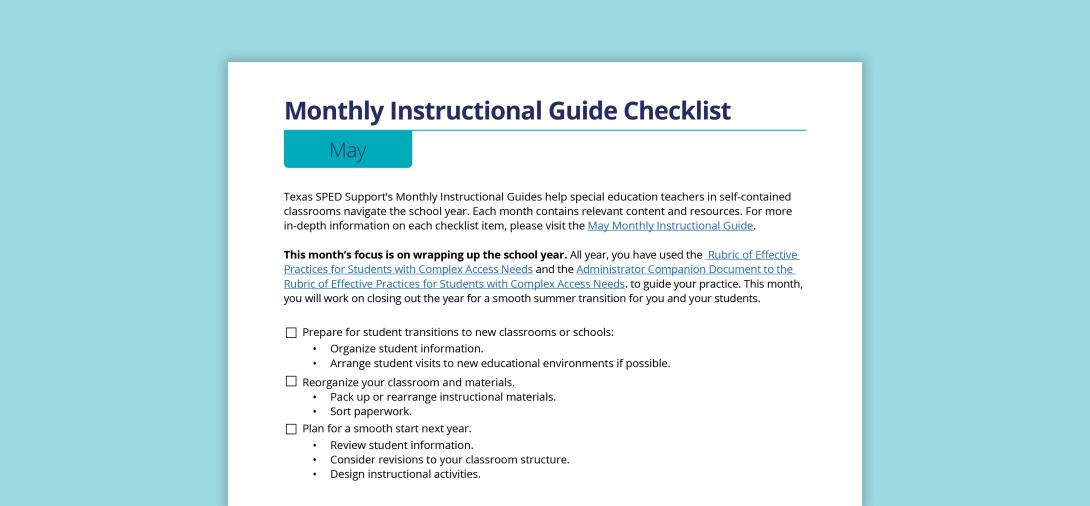 Texas SPED Support’s Monthly Instructional Guides help special education teachers in self-contained classrooms navigate the school year. Each month contains relevant content and resources.