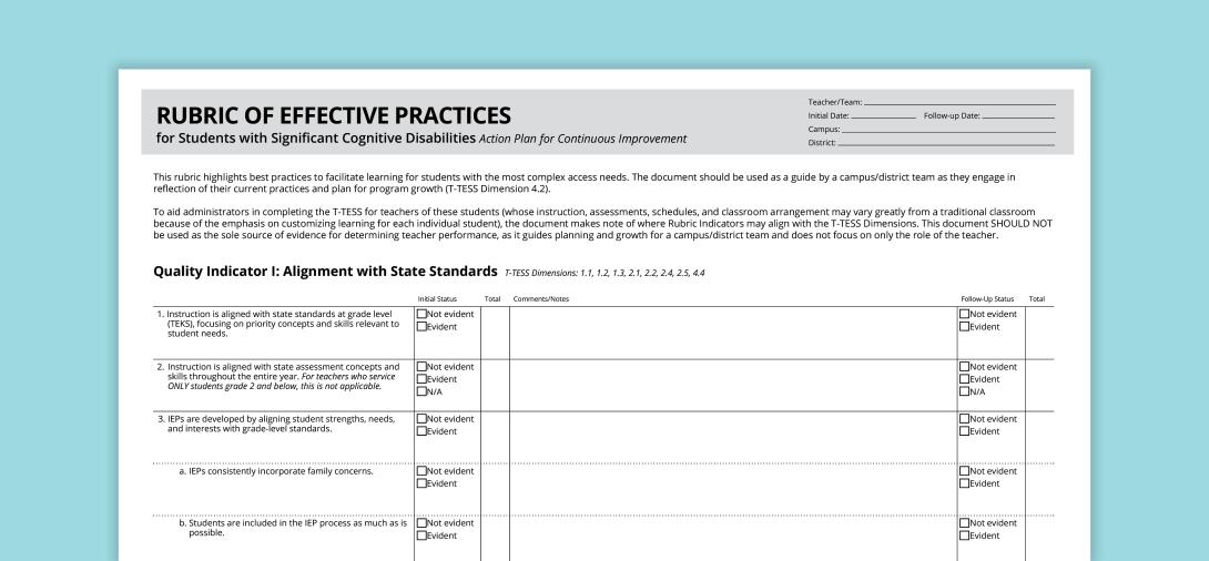 This rubric highlights best practices to facilitate learning for students with complex access needs. The document should be used as a guide by a campus/district team as they engage in reflection of their current practices and plan for program growth (T-TESS Dimension 4.2).