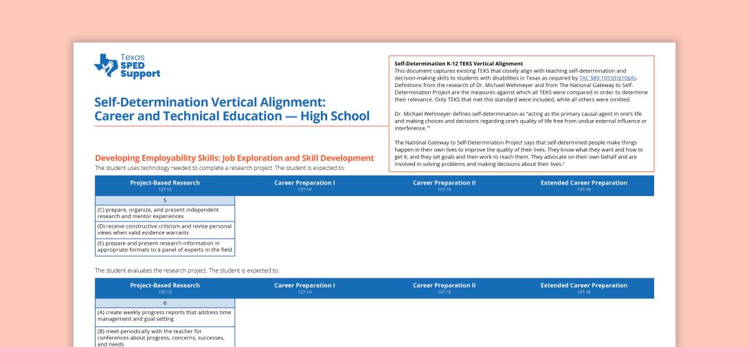 Educators may use this document to consider where self-determination skills are addressed in CTE TEKS for high school or to develop standards-based annual individualized education program (IEP) goals for a specific student.