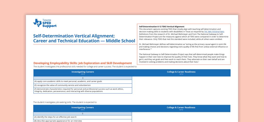 Self-determination skills aligned with the CTE TEKS for middle school.
