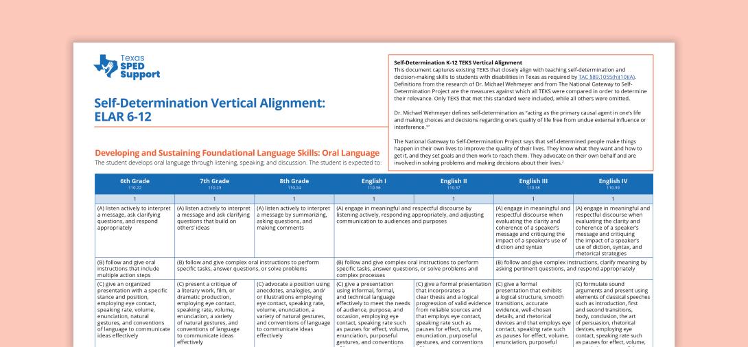 Educators may use this document to consider where self-determination skills are addressed in ELAR TEKS for middle and high school or to develop standards-based annual individualized education program (IEP) goals for a specific student.