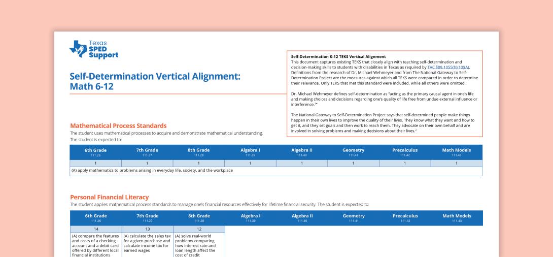 Educators may use this document to consider where self-determination skills are addressed in math TEKS for middle and high school or to develop standards-based annual individualized education program (IEP) goals for a specific student.