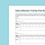 Trial-by-trial data collection is used often for academic tasks. Record data for each opportunity, or trial, the student is given. The data may be reported in trials or in percentages, depending on how the goal is written.
