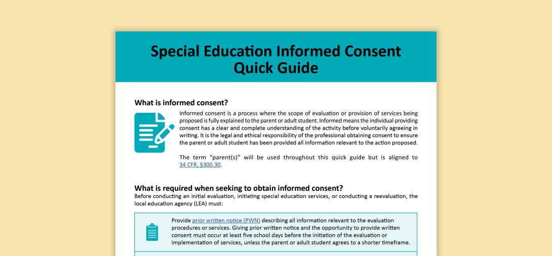 Key points and important resources for local education agencies (LEAs) to consider for obtaining informed consent for special education evaluations and services. The quick guide provides an overview of procedures and requirements for obtaining informed consent and legal and state resources. An asynchronous video module and handout also accompany this quick guide.