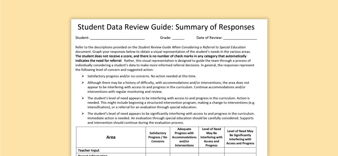 The Student Data Review Guide Summary of Responses provides an opportunity to graph responses from the Student Data Review Guide to obtain a visual representation of the student’s needs in the various areas. This visual representation is designed to guide the team through a process of individually considering a student’s data to make more informed referral decisions.
