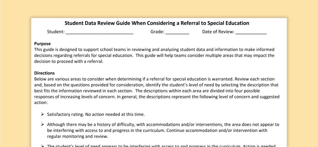 The Student Data Review Guide When Considering a Referral to Special Education is designed to support school teams in reviewing and analyzing student data and information to make informed decisions regarding referrals for special education. This guide will help teams consider multiple areas that may impact the decision to proceed with a referral.